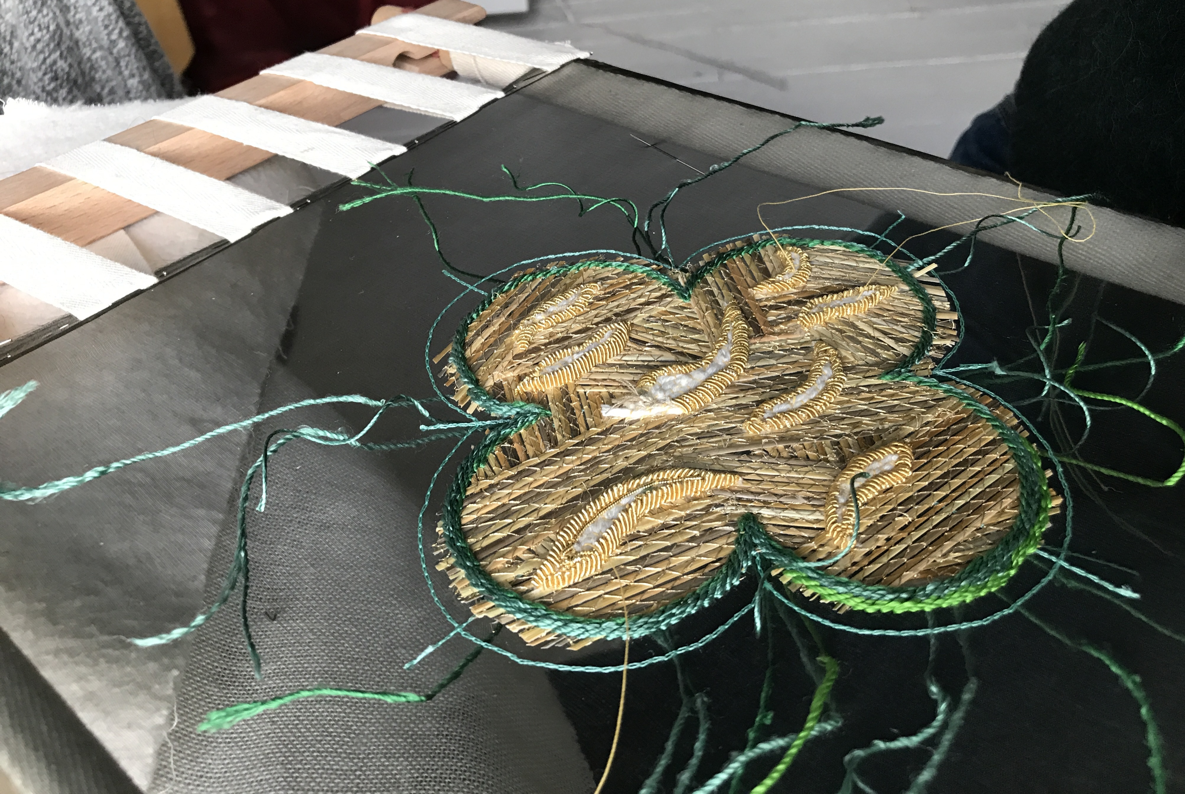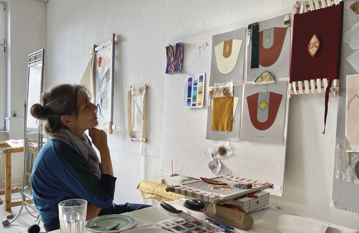 Fire broderede messehageler til Sorø Klosterkirke er udstillet på Sorø Kunstmuseum.